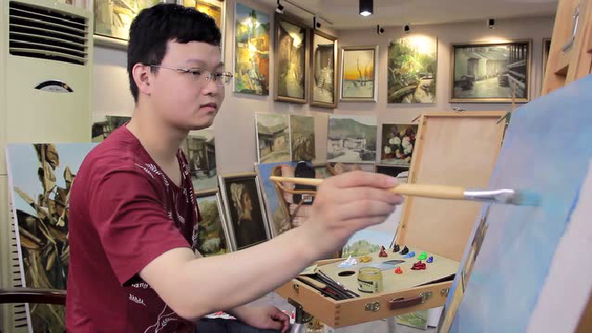 一间60平米大的房间,地上堆放着各种画笔和油彩,墙上挂着题材多样的油画,一切看上去整洁而又明亮,这就是张力中的画室。普通人尚不会有此成绩,而他更与常人有所不同。1992年某个夜晚,10个月大的张力中因高烧导致双耳失聪,后被确诊为重度型耳聋,因听力受损,缺少与人交流,张力中在语言表达上也受到了一些影响。在几乎无声的世界里,张力中上小学、中学,从未放弃,更因为对色彩的敏感,张力中逐渐开始接触绘画这门艺术,勤学苦练13年,期间,他先后登门向当地几名资深美术教师学习,从基础绘画技法到学习油画,张力中勤勤恳恳,从不懈怠。