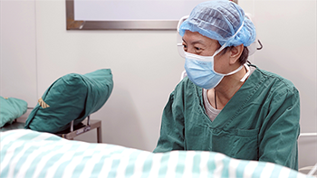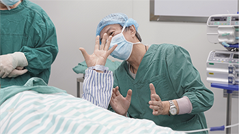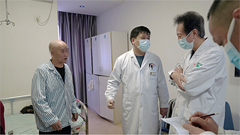 手术台上,这位帕金森患者正在进行定位脑手术,解决其一侧肢体抖动的问题。刚开始患者有点害怕,在赵全军教授及其他手术医生的安慰和指导下,配合医生做动作,慢慢的在手术台上就不抖了。