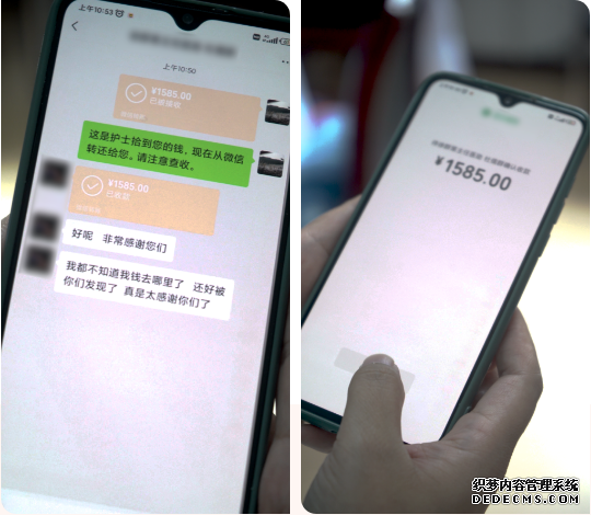 事后,张晓梅告诉我们,患者来看病已经花了不少钱了,一千多块钱也不是小数目,肯定是要给患者还回去的。张婧护士长迅速通过微信联系上了患者,由于患者已经出院,来一趟医院也不容易,便将1585元通过微信转账给了患者。