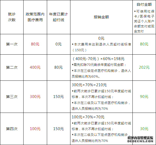 问:成都市退休参保人员张大爷2023年内,第一次因头晕头痛到某社区卫生服务中心门诊就诊花费80元,第二次因上呼吸道感染到某三级医院门诊就诊花费400元,第三次因脑短暂缺血到某二级医院门诊就诊花费300元,第四次因恶心呕吐到某社区卫生服务中心就诊花费100元,他分别能够报销多少钱?